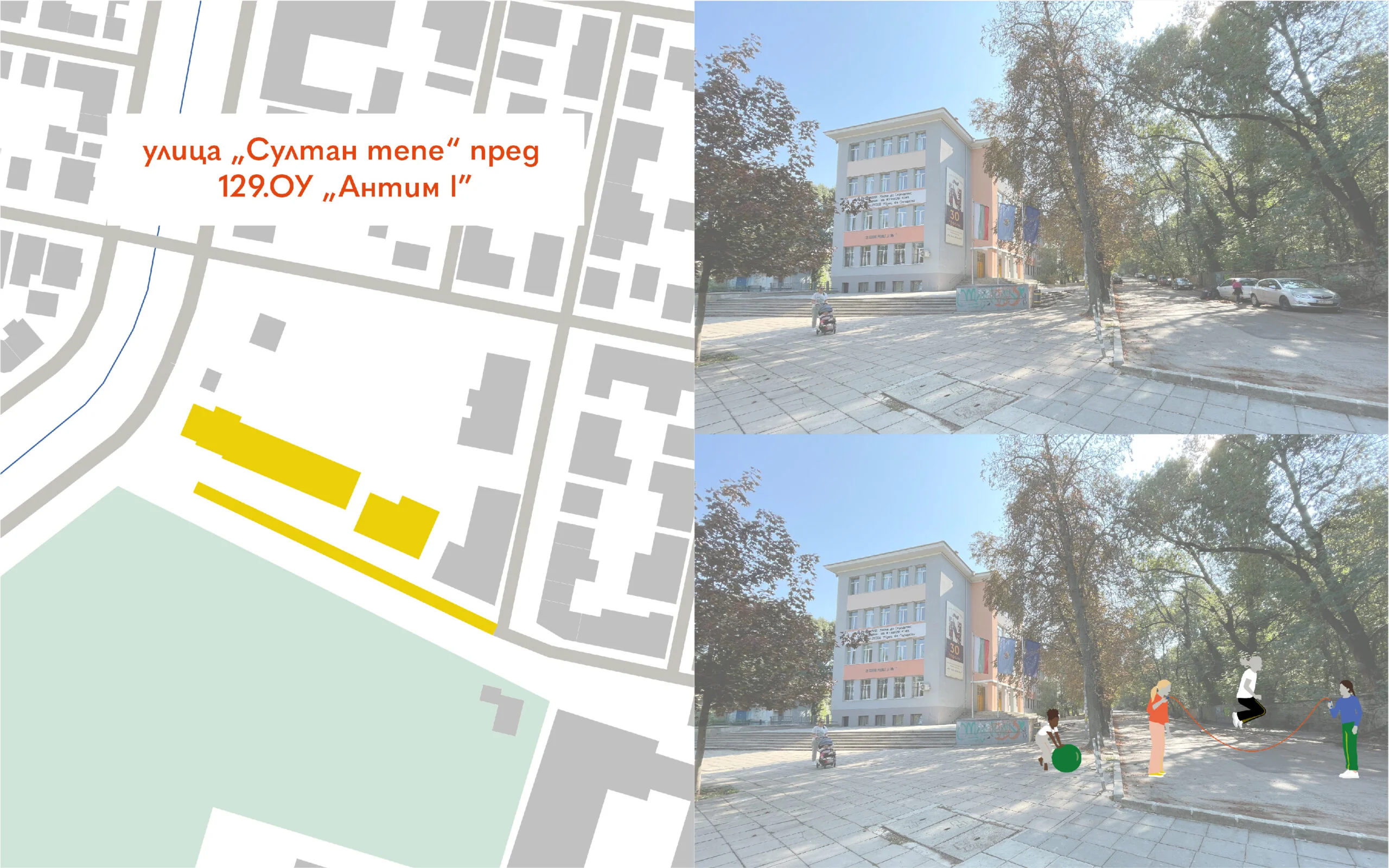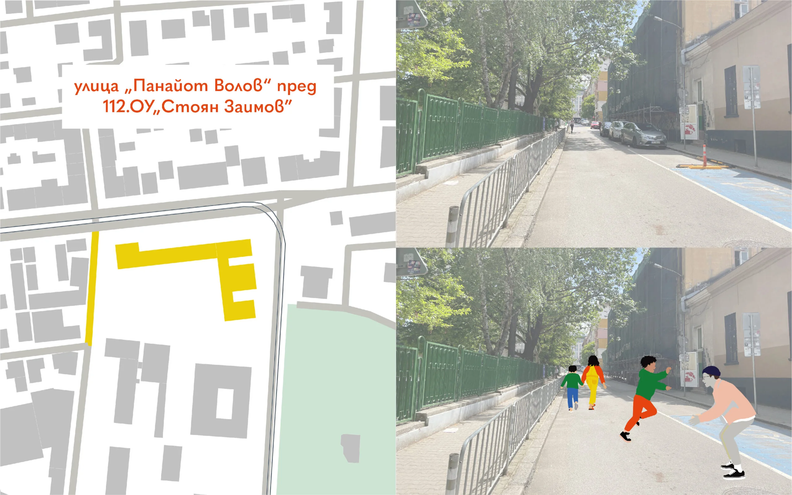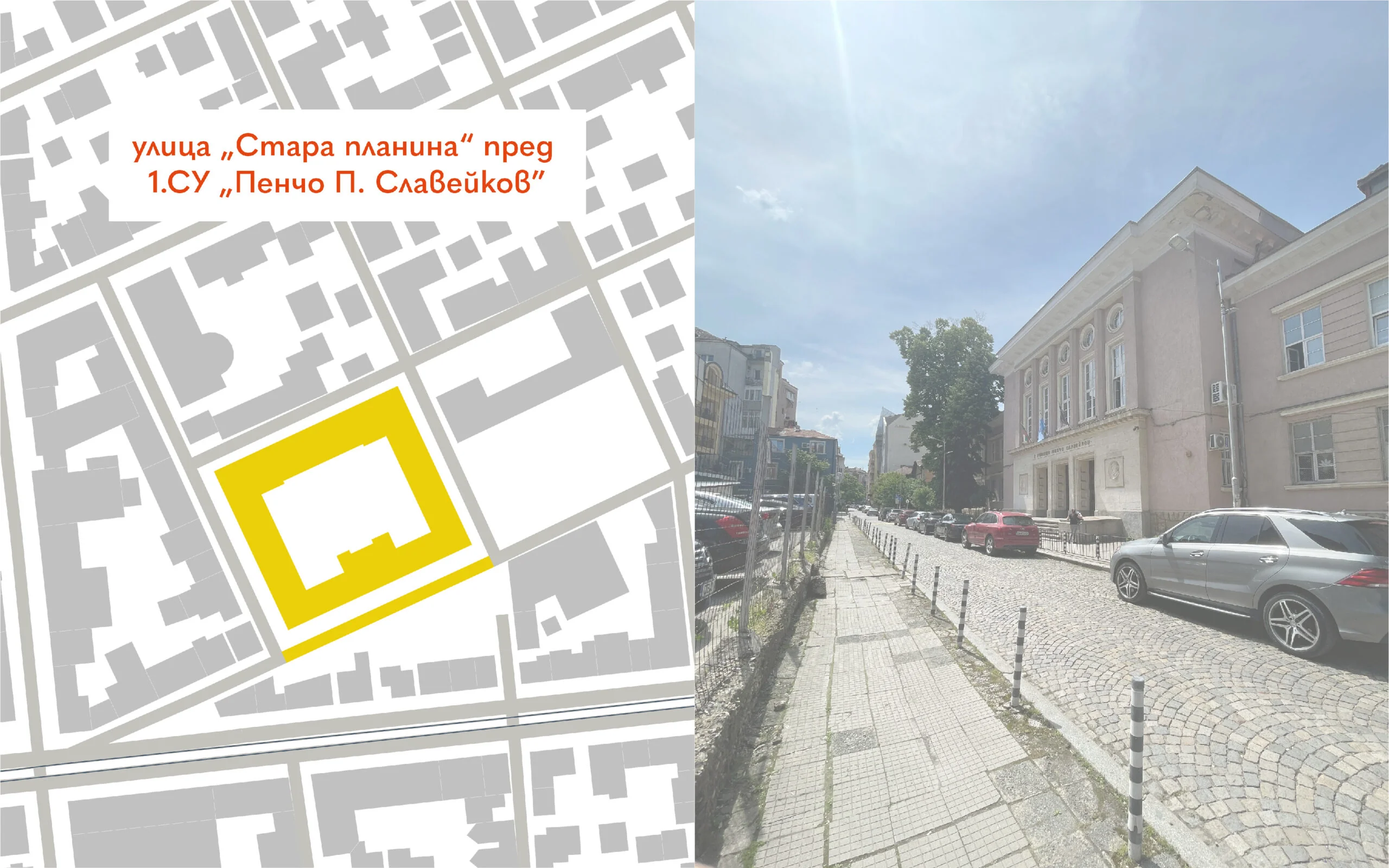 Улица „Стара планина” пред 1.СУ „Пенчо П. Славейков” беше затворена за автомобилен трафик в рамките на 8 часа, а пространството пред училището беше отворено за общуване и игра.
