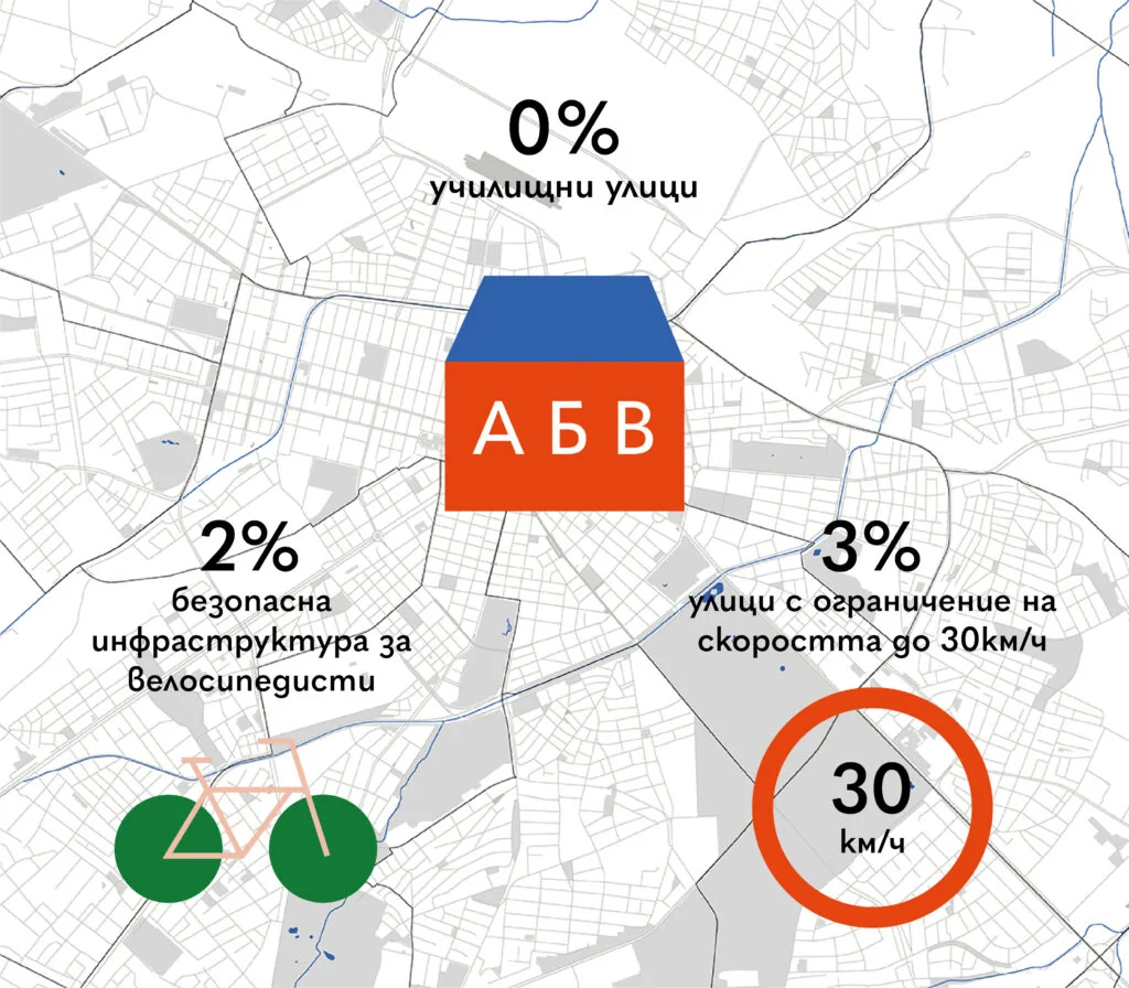 В София има 0% училищни улици, 2% улици с ограничение на скоростта до 30км/ч и 3% безопасна инфраструктура за велосипедисти.